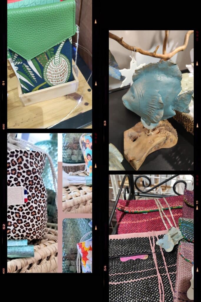 Plusieurs domaines sont présentés, il y a des sacs en cuir, des bijoux fantaisie, des céramiques, des cosmétiques, des illustrations, des articles zéro déchet de la décoration d’intérieur, des coussins et des articles pour bébé.
