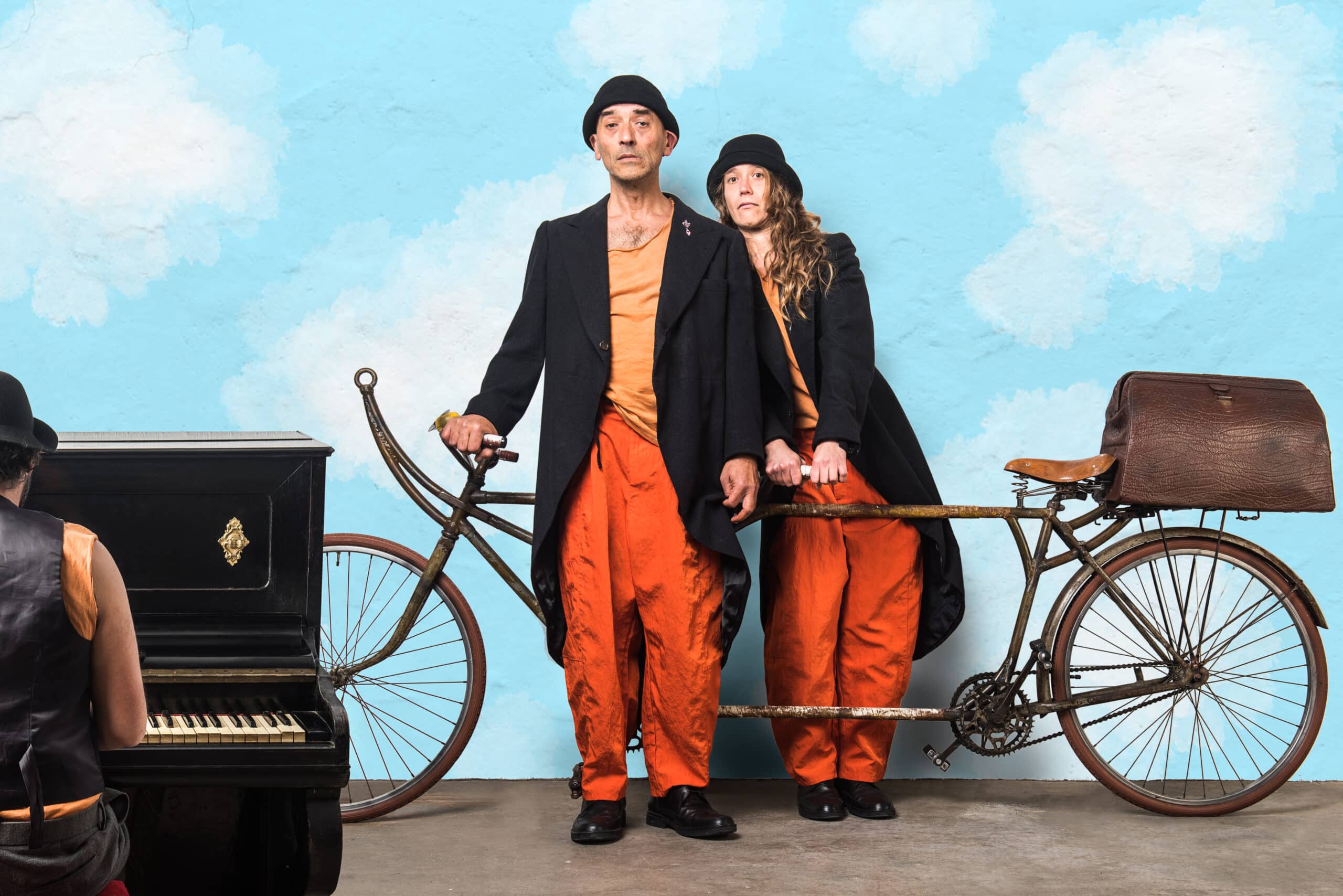 Une bicyclette volante, du bois, du fer, de la poussière, de grosses chaussures et des chapeaux jusqu’aux sourcils. La lune nous attend. “Fly me to the moon” est le voyage possible de deux clowns vers la lune. C’est la prouesse du rêveur, la prouesse de deux innocents.